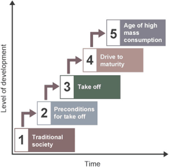 یکی از بهترین مدلهایی که نگاه نوسازی را تشریح کرده است، مدل رشد روشتو (Rostow) است. بر اساس این مدل توسعه را میتوان حاصل گذار از ۵ وضعیت اصلی دانست، که یک جامعه از وضعیت سنتی به سمت یک وضعیت بالغ حرکت میکند:۱-جوامع سنتی